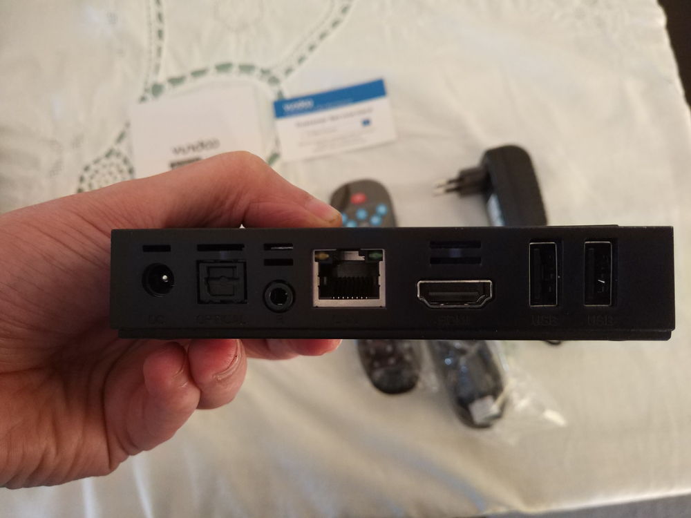Στο πίσω μέρος της συσκευής έχουμε την είσοδο για την τροφοδοσία της συσκευής, μία οπτική έξοδο για τον ήχο, μία SPDIF έξοδο, μία θύρα Gigabit LAN, μία έξοδο HDMI 2.0 και 2 θύρες USB 2.