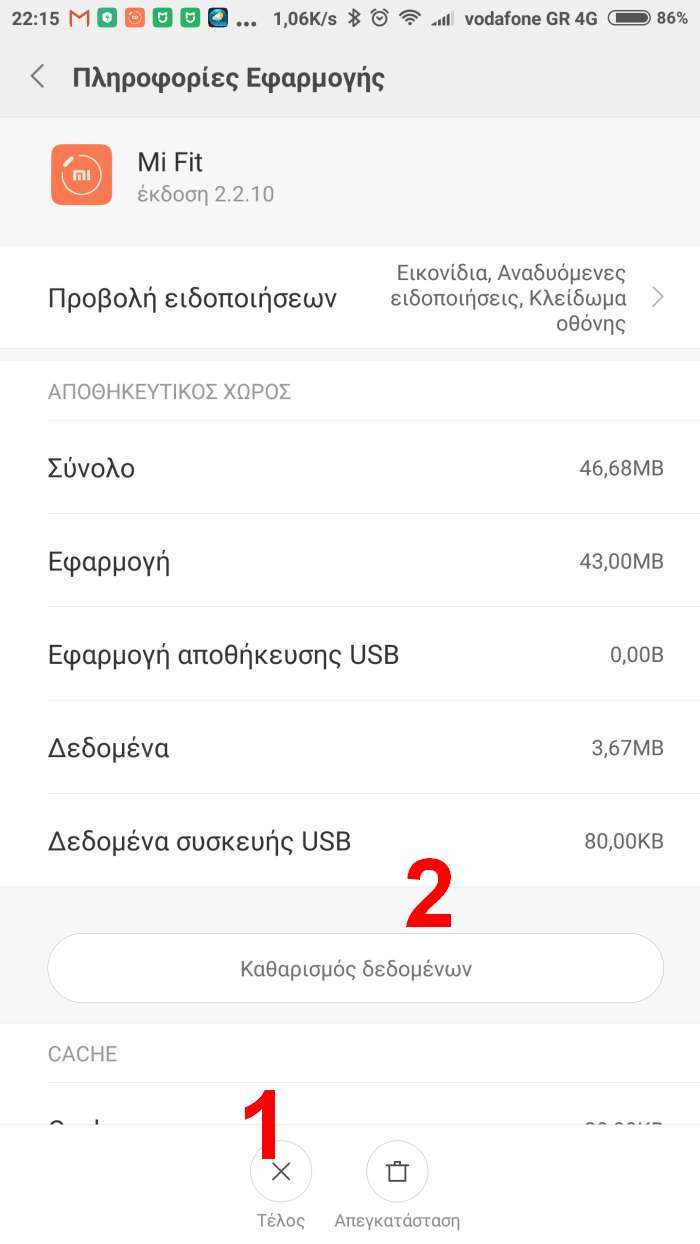 1. Κλείνουμε την εφαρμογή με το αριστερό κουμπί και το Χ. Δεν πρέπει να τρέχει. Δεν της κάνουμε απεγκατάσταση. Μετά πάμε ρυθμίσεις -> Εφαρμογές -> Mi Fit και αφού τελειώσει τον υπολογισμό, πατάμε καθαρισμό και μετά Τέλος. Εάν σας πει ότι δεν πρέπει, εσείς θα δείξετε πειθώ και θα πείτε Τέλος! Υπόψιν ΔΕΝ κάνουμε απεγκατάσταση