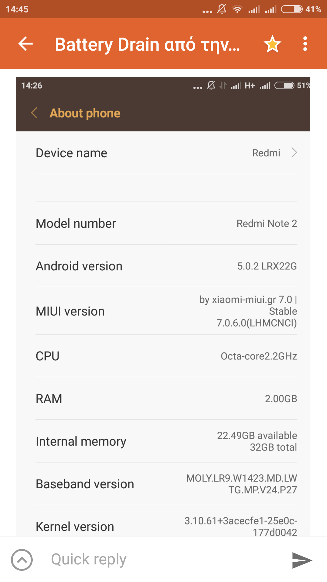Κατά μέσο όρο σε ένα μισάωρο χρήσης (σχετικά συνεχούς) χάνω 20-25% μπαταρίας. Επισυνάπτω screenshots από διάφορες χρονικές στιγμές για να δείτε κατανάλωση κτλ καθώς και την έκδοση miui που έχω (το τελευταίο ελληνικό stable από εδώ) και θέτω τελικά το εξής ερώτημα:
