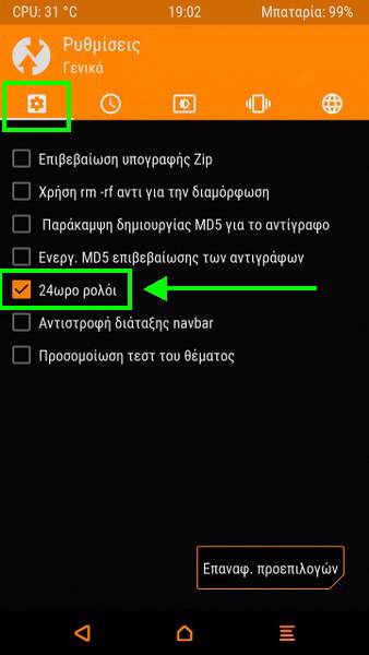 Επίσης, επειδή η ώρα που δείχνει το TWRP by default είναι "koykoyroykoy time", θα τη ρυθμίσουμε να δείχνει "Ώρα Ελλάδος"...