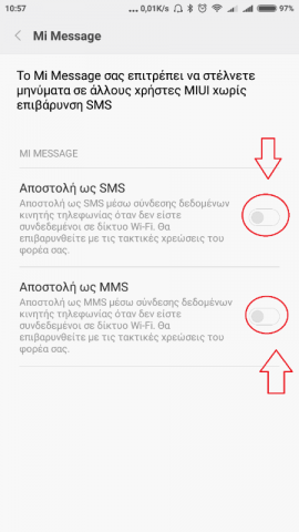 Τι γίνεται όμως αμα στείλουμε με Mi message και δεν σταλλεί?Υπάρχουν 2 επιλογές ή θα σταλλεί απο μόνο του μετά κανονικά ή θα αποτύχει(ειδοποιεί όπως οταν δεν στέλνεται μήνυμα) και θα περιμένει ενέργεια απο εσάς.Το τι θα κάνει εξαρτάται απο τη ρύθμιση που θα κάνετε, ας δούμε πως. Στις ρυθμίσεις μηνυμάτων εκεί που λέει Συνδεδεμένος/Αποσυνδεδεμένος πατάμε πάνω του, στην οθόνη που θα εμφανιστεί επιλέγουμε αν δεν σταλλεί ως Mi message πως θα σταλλεί(SMS/MMS). Σε περίπτωση που θέλουμε όπως και να έχει να σταλλεί ως Mi message(για να μην χρεωθούμε) τότε στο συγκεκριμένο μενού απενεργοποιούμε και τις δύο λειτουργίες