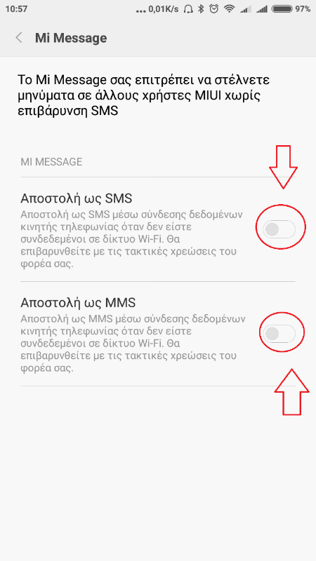 Τι γίνεται όμως αμα στείλουμε με Mi message και δεν σταλλεί?Υπάρχουν 2 επιλογές ή θα σταλλεί απο μόνο του μετά κανονικά ή θα αποτύχει(ειδοποιεί όπως οταν δεν στέλνεται μήνυμα) και θα περιμένει ενέργεια απο εσάς.Το τι θα κάνει εξαρτάται απο τη ρύθμιση που θα κάνετε, ας δούμε πως. Στις ρυθμίσεις μηνυμάτων εκεί που λέει Συνδεδεμένος/Αποσυνδεδεμένος πατάμε πάνω του, στην οθόνη που θα εμφανιστεί επιλέγουμε αν δεν σταλλεί ως Mi message πως θα σταλλεί(SMS/MMS). Σε περίπτωση που θέλουμε όπως και να έχει να σταλλεί ως Mi message(για να μην χρεωθούμε) τότε στο συγκεκριμένο μενού απενεργοποιούμε και τις δύο λειτουργίες