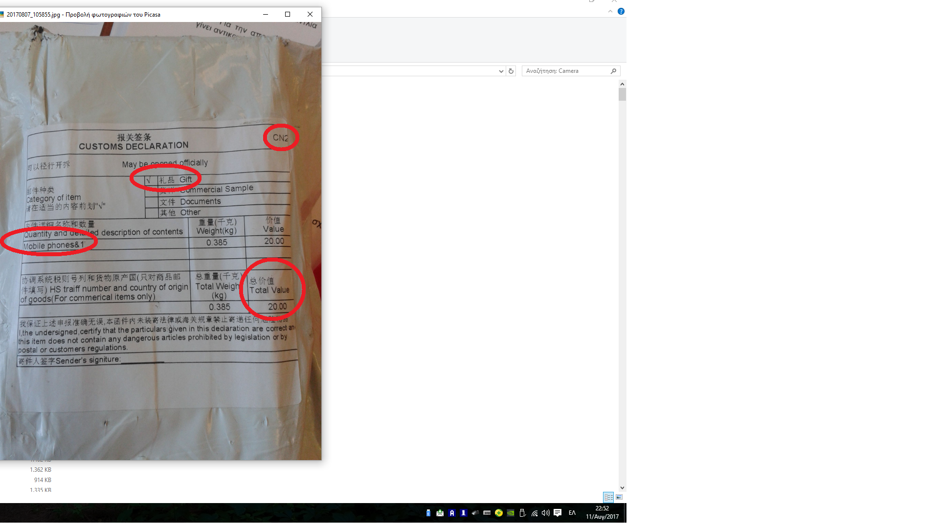 Επίσης σε αυτή της Σιγκαπούρης γράφει "mobile phones","gift","value 20 USD" ότι πρέπει για "ξεκάρφωμα"