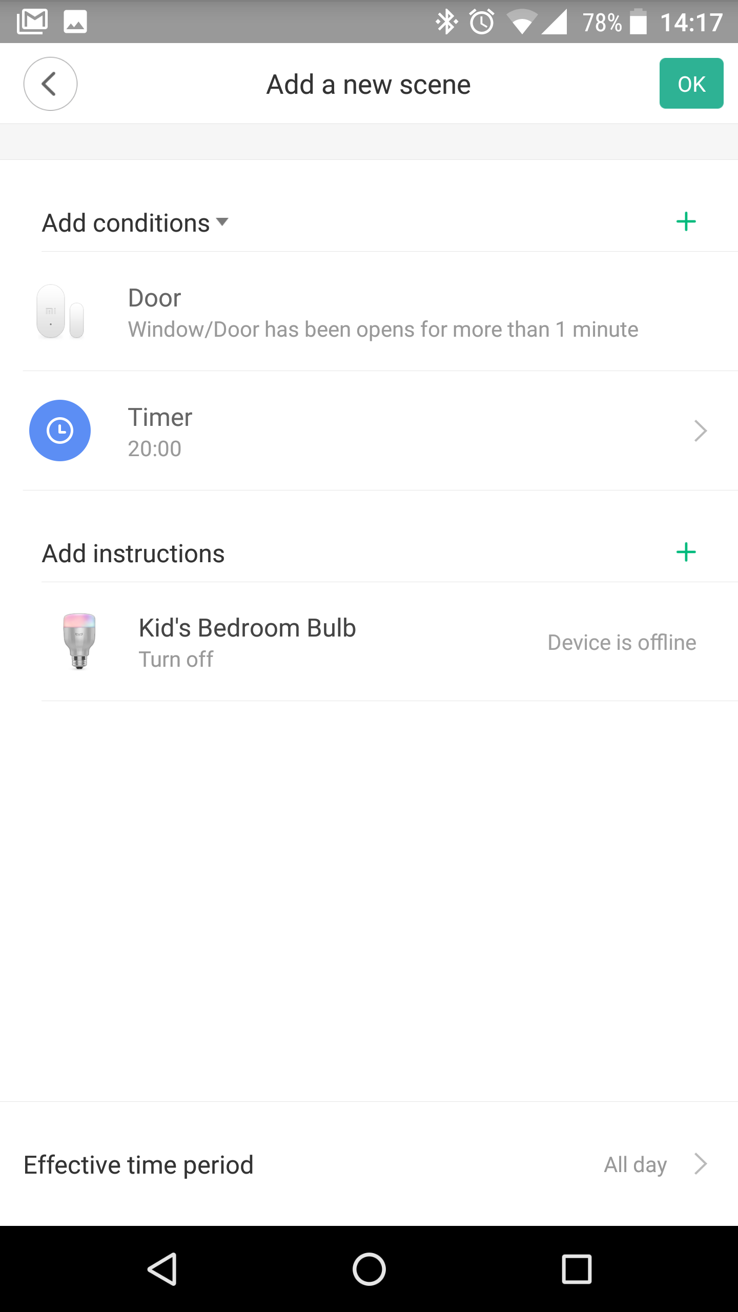 πατώντας λοιπόν την επιλογή για άνοιγμα στο επόμενο βήμα θα δεις ότι θα έχεις διαθέσιμη την επιλογή να για να ανοίγει η λάμπα. θα κάνεις άλλο ένα αντίστοιχο σενάριο για το κλείσιμο πόρτας να σβήνει η λάμπα. για το τρίτο τώρα, όπως βλέπεις η επιλογή είναι τι θέλεις να κάνει σε περίπτωση που μείνει ανοιχτή για πάνω από ένα λεπτό. Αυτό δυστυχώς δεν μπορείς να το παραμετροποιήσεις. Νομίζω όμως ότι φτιάχνοντας άλλο ένα σενάριο και προσθέτοντας και ένα timer στα 20 λεπτά, ώστε μετά από αυτόν το χρόνο να τρέξει το σενάριο σου, θα σβήσει το φως. αν μπορέσω θα το δοκιμάσω και θα το επιβεβαιώσω, αν και είναι δύσκολο γιατί ο αισθητήρας είναι στην κεντρική είσοδο. δες το screenshot παρακάτω