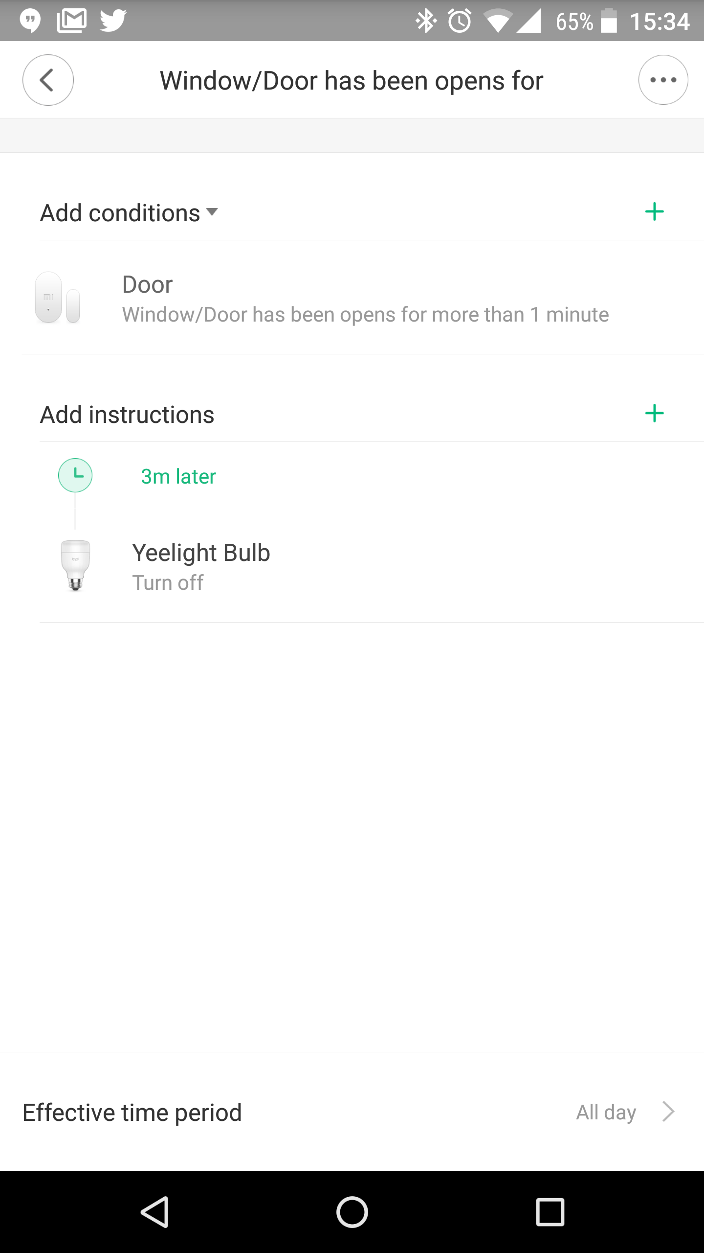 πατώντας λοιπόν την επιλογή για άνοιγμα στο επόμενο βήμα θα δεις ότι θα έχεις διαθέσιμη την επιλογή να για να ανοίγει η λάμπα. θα κάνεις άλλο ένα αντίστοιχο σενάριο για το κλείσιμο πόρτας να σβήνει η λάμπα. για το τρίτο τώρα, όπως βλέπεις η επιλογή είναι τι θέλεις να κάνει σε περίπτωση που μείνει ανοιχτή για πάνω από ένα λεπτό. Αυτό δυστυχώς δεν μπορείς να το παραμετροποιήσεις. Νομίζω όμως ότι φτιάχνοντας άλλο ένα σενάριο και προσθέτοντας και ένα timer στα 20 λεπτά, ώστε μετά από αυτόν το χρόνο να τρέξει το σενάριο σου, θα σβήσει το φως. αν μπορέσω θα το δοκιμάσω και θα το επιβεβαιώσω, αν και είναι δύσκολο γιατί ο αισθητήρας είναι στην κεντρική είσοδο. δες το screenshot παρακάτω