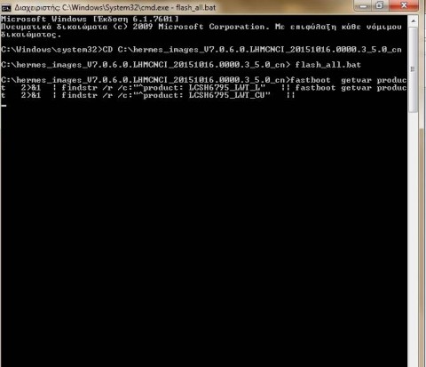 - γράφουμε στη γραμμή εντολών flash_all.bat πατάμε Enter και περιμένουμε να κανει reboot το τηλέφωνο (δεν κλείνουμε το cmd όσο "γραφεί" τα αρχεία)