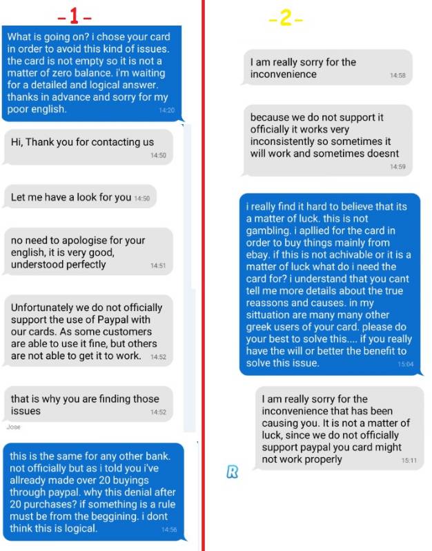 Μιλαγα τωρα με το support της Revolut. Μου ειπε με αλλα λογια την ιδια "ταταριά" π μου ειπανε κ απο την πειραιως παλια. Οτι κυριε δεν υποστηριζουμε επισημα το Paypal κ ειναι θεμα στιγμιαιας συγκυριας αν θα περασει η καρτα ή οχι σε καθε αγορα. Κ του απανταω οτι αν ισχυει κατι πρεπει να ισχυει απο την αρχη σαν κανονας κ οχι να ειναι θεμα τυχης λες κ παιζουμε σε καζινο. Κ μου ελεγε να δοκιμασω αργοτερα μηπως διορθωθει κ οτι κ καλα εργαζονται πανω στο προβλημα κ τετοια ωραια. Ειναι απλο ειτε η ιδια η Revo ειτε με πιεση το paypal θελανε να σταματησουνε ολο αυτο κ απ'οτι φενεται θα το κανουνε. Αρα παμε ξανα στο κολπο με το paypal balance.....