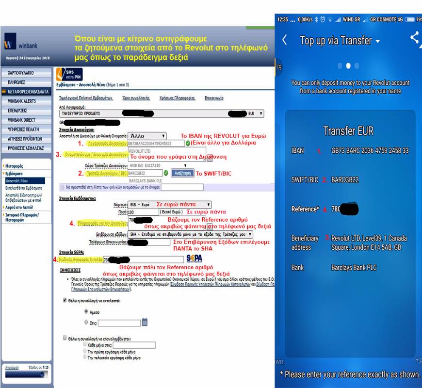 Παρακάτω βλέπουμε πως συμπληρώνουμε τα στοιχεία στο Web Banking της Alpha Bank (Αριστερό μέρος το web banking και δεξιά η οθόνη του κινητού μας με το Revolut)