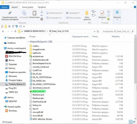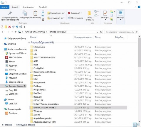 1. Στο δίσκο C:/ δημιουργούμε έναν φάκελο που τον ονομάζουμε όπως θέλουμε. Στην περίπτωσή μου εγώ τον ονόμασα UNBRICK_REDMI_NOTE_2 και μέσα σε αυτόν αποσυμπιέζουμε το SP Flash Tool με τους VCom Drivers και την FASTBOOT Rom του κινητού μας. Καλύτερα να μην περιέχει κενά και να είναι στα λατινικά.