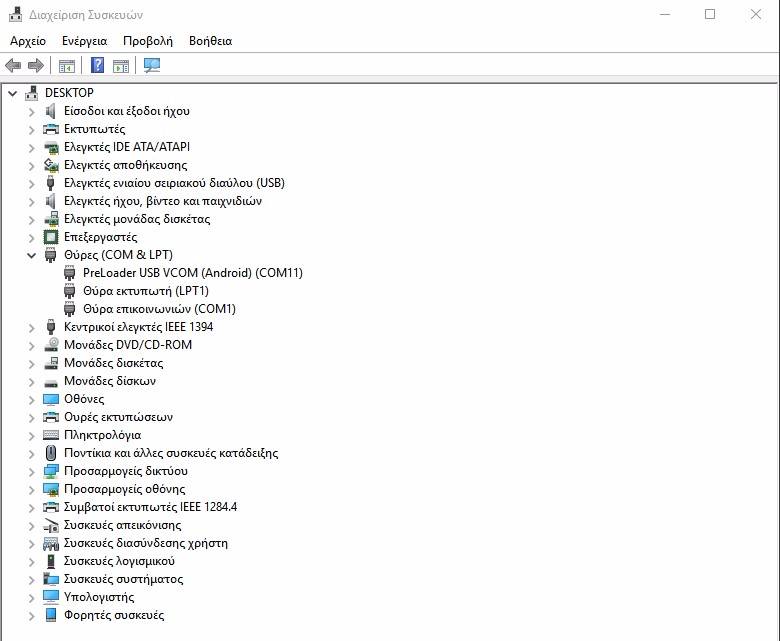 2. Αφού εγκαταστήσουμε τον Preloader USB Vcom Driver, ελέγχουμε αν ο υπολογιστής μας βλέπει το τηλέφωνό μας. Θα πρέπει να το συνδέσουμε στη USB κλειστό και χωρίς μπαταρία. Αν δεν το βλέπει, δοκιμάζουμε με μπαταρία αλλά πάντα κλειστό. Θα πρέπει να δούμε στη διαχείριση συσκευών του υπολογιστή στις θύρες COM το Preloader USB Vcom όπως στη φωτογραφία. Το PC θα το βλέπει και μετά θα το χάνει και αυτό θα γίνεται συνέχεια. Αυτό δεν μας ανησυχεί. Εφόσον το βλέπει έστω και για λίγο είμαστε εντάξει. Αποσυνδέουμε το τηλέφωνο από τον υπολογιστή.