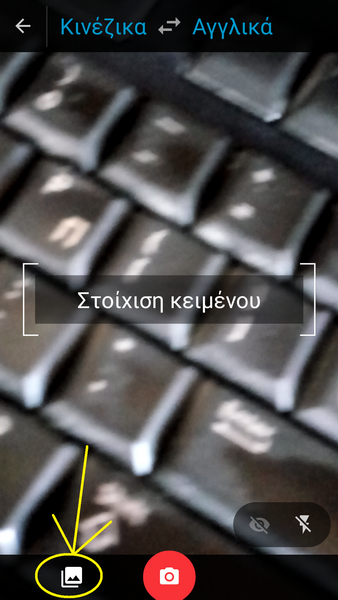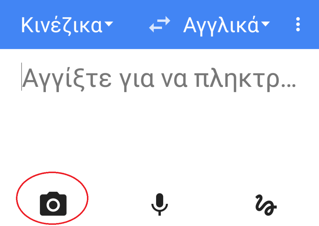 Η εφαρμογή μας δίνει την δυνατότητα να μεταφράσουμε φωτογραφία, ήχο ή χειρόγραφο. Εμείς επιλέγουμε φωτογραφία πατώντας το εικονίδιο της φωτογραφικής μηχανής.