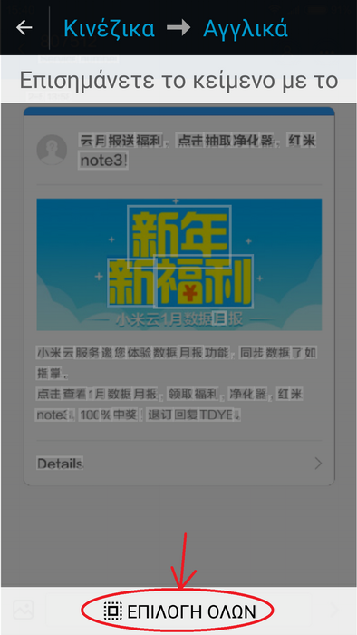 Εμείς έχουμε προηγουμένως πάρει στιγμιότυπο από το κείμενο που θέλουμε να μεταφράσουμε κρατώντας συγχρόνως τους διακόπτες (Power+ Vol-)
