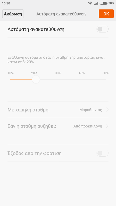 Στην μπάρα αυτή μπορείς να ρυθμίσεις όταν το κινητό σου φτάσει σε επίπεδο μπαταρίας το ποσοστό που έχεις επιλέξει τότε μπαίνει σε λειτουργία Μαραθώνιου (χαμηλός φωτισμός, διαδικτυο off κ.α. ) ώστε να εξοικονομήσει πόρους