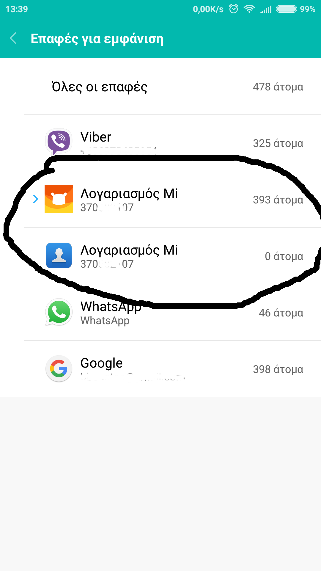 εκει το βλέπω. Εντάξει είμαι έχω επιλέξει ποιον λογαριασμό θα βλέπω αλλά εκεί στις επαφές για εμφάνιση βλέπω δυο mi account me το ίδιο id