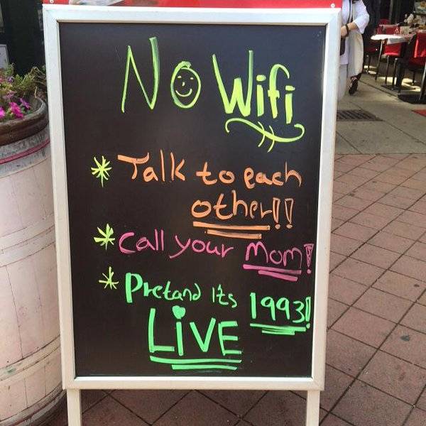 ...στις σημερινές λέω να ανοίξω ένα καφέ με απενεργοποιητή κινητών και χωρίς WiFi ....ή να βάλω κωδικό WiFi : denexoumewifimilistemetaxisas ?