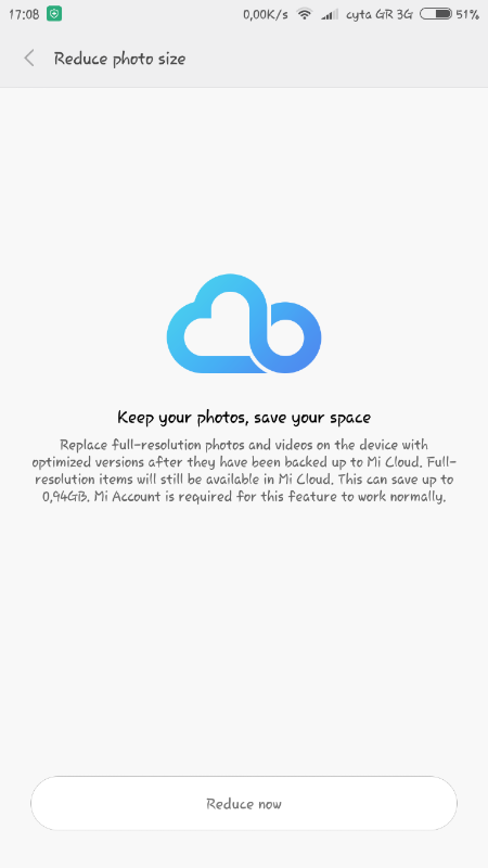 Ουσιαστηκά θέλει να σε κάνεις να ενεργοποιήσεις το online backup των φωτό με τον mi λογαριασμό σου, ώστε να έχεις online τις πρωτότυπες και στο κινητό σε πιο χαμηλή ποιότητα, για να έχεις χώρο για καινούργιες και ν'αγοράσεις online χώρο.
