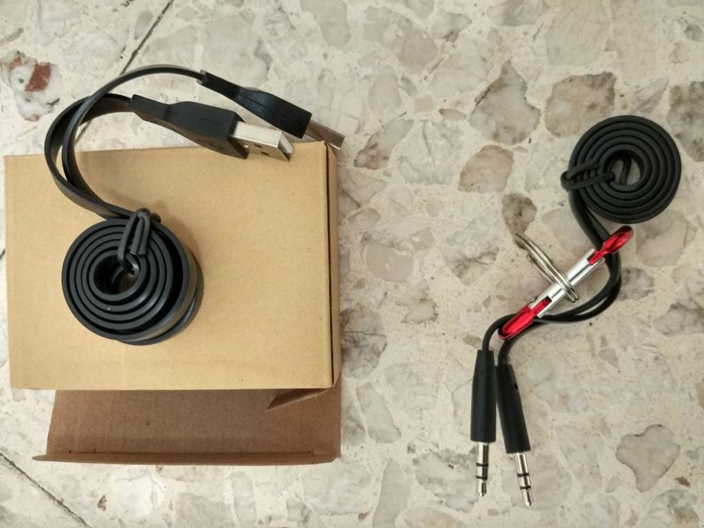 Ανοίγοντας την από μέσα ένα σκληρό χάρτινο κουτί με αυτοκόλλητο πάνω CE. Μέσα σε αυτό το κουτί βρισκόταν το μεγάφωνο, ένας μικρός γάντζος και ένα άλλο κουτάκι που είχε μέσα 2 σύρματα. Ένα usb σε usb για να φορτίζει και ένα line in για να μπορείς να το ενώσεις σε άλλες συσκευές. Στο τέρμα κάτω βρισκόταν και το manual του.