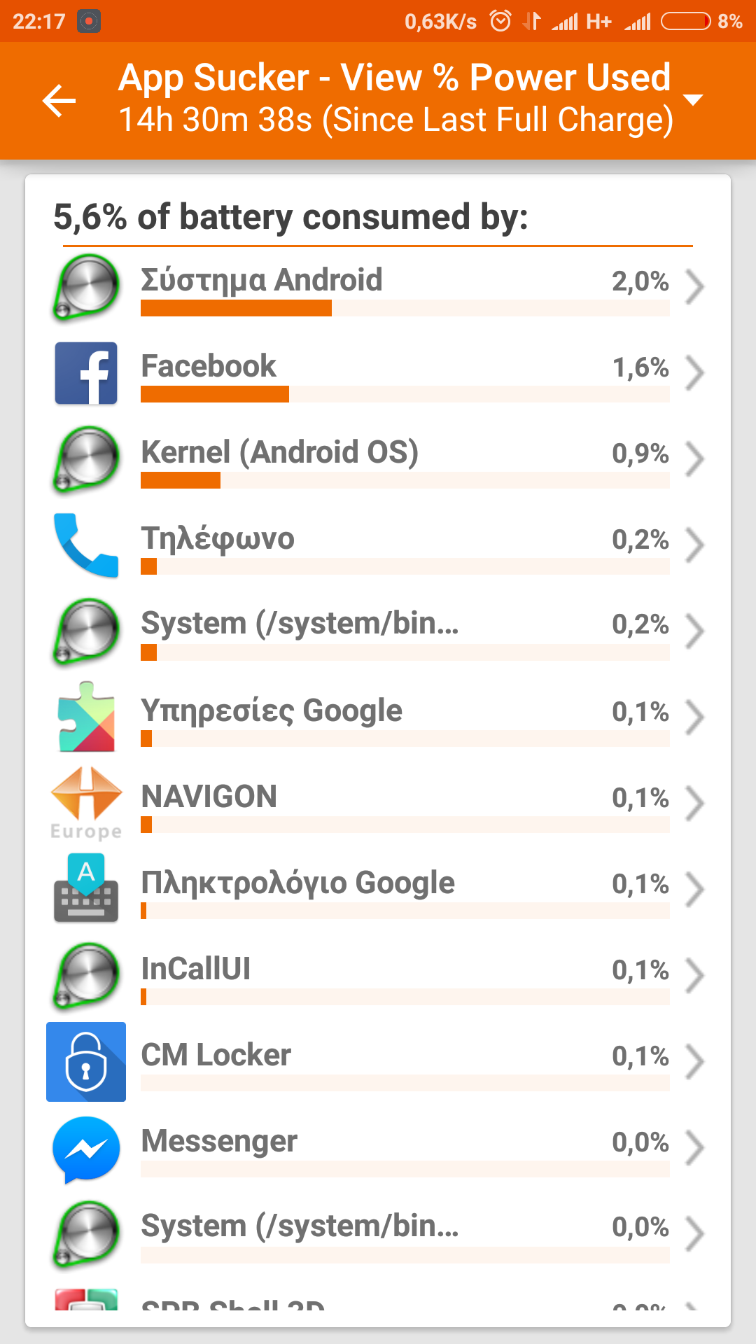 Το εβγαλα απο το ρευμα στις 8,00 το πρωι και το αποτελεσμα του gsam ειναι στις 21,00 το βραδυ. Ειναι 13 ωρες. ΑΠΟΚΛΕΙΕΤΑΙ η οθονη να ειναι ανοιχτη πανω απο 4 ωρες γιατι και στην τσεπη που το βαζω παταω πρωτα το κουμπι και το κλεινω απο συνηθεια. Εκτος αν βραχυκυκλωνει. Η τσεπη του μπουφαν που το βαζω ειναι εσωτερικη και πολυ φαρδια. ΣΤο φβ ημουν 1 ωρα και 38 λεπτα ενω το συστημα android λεει 1 ωρα και 38 δευτερολεπτα. Καμμια σχεση. Δεν κανω κατι αλλο. Μιλαω και μπαινω φβ. Και στη σημερινη αναφορα κατι τετοιο λεει για 12,5 ωρες ανοιχτη οθονη. Μηπως το κλειδωμα οθονης CM Locker το δημιουργει;;Ο/H mixaliscy έγραψε: