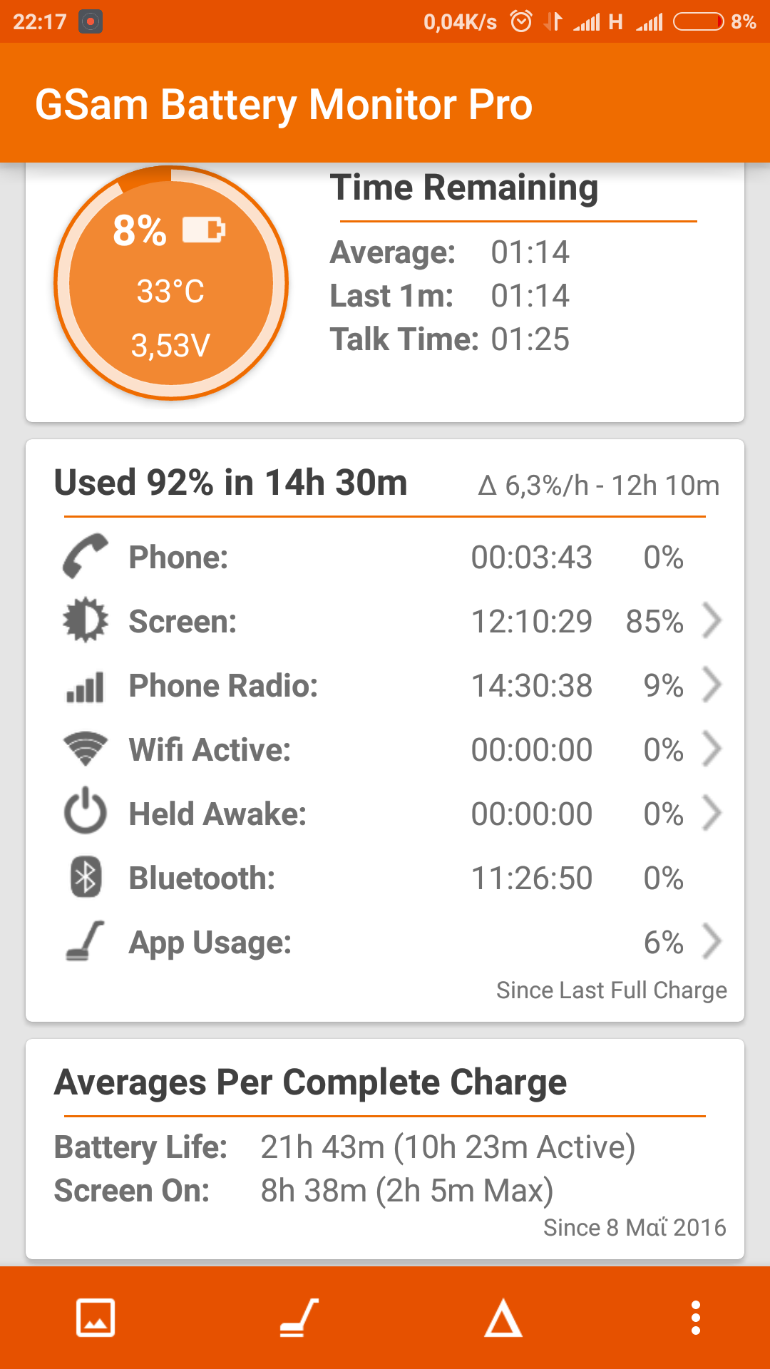 Το εβγαλα απο το ρευμα στις 8,00 το πρωι και το αποτελεσμα του gsam ειναι στις 21,00 το βραδυ. Ειναι 13 ωρες. ΑΠΟΚΛΕΙΕΤΑΙ η οθονη να ειναι ανοιχτη πανω απο 4 ωρες γιατι και στην τσεπη που το βαζω παταω πρωτα το κουμπι και το κλεινω απο συνηθεια. Εκτος αν βραχυκυκλωνει. Η τσεπη του μπουφαν που το βαζω ειναι εσωτερικη και πολυ φαρδια. ΣΤο φβ ημουν 1 ωρα και 38 λεπτα ενω το συστημα android λεει 1 ωρα και 38 δευτερολεπτα. Καμμια σχεση. Δεν κανω κατι αλλο. Μιλαω και μπαινω φβΟ/H mixaliscy έγραψε: