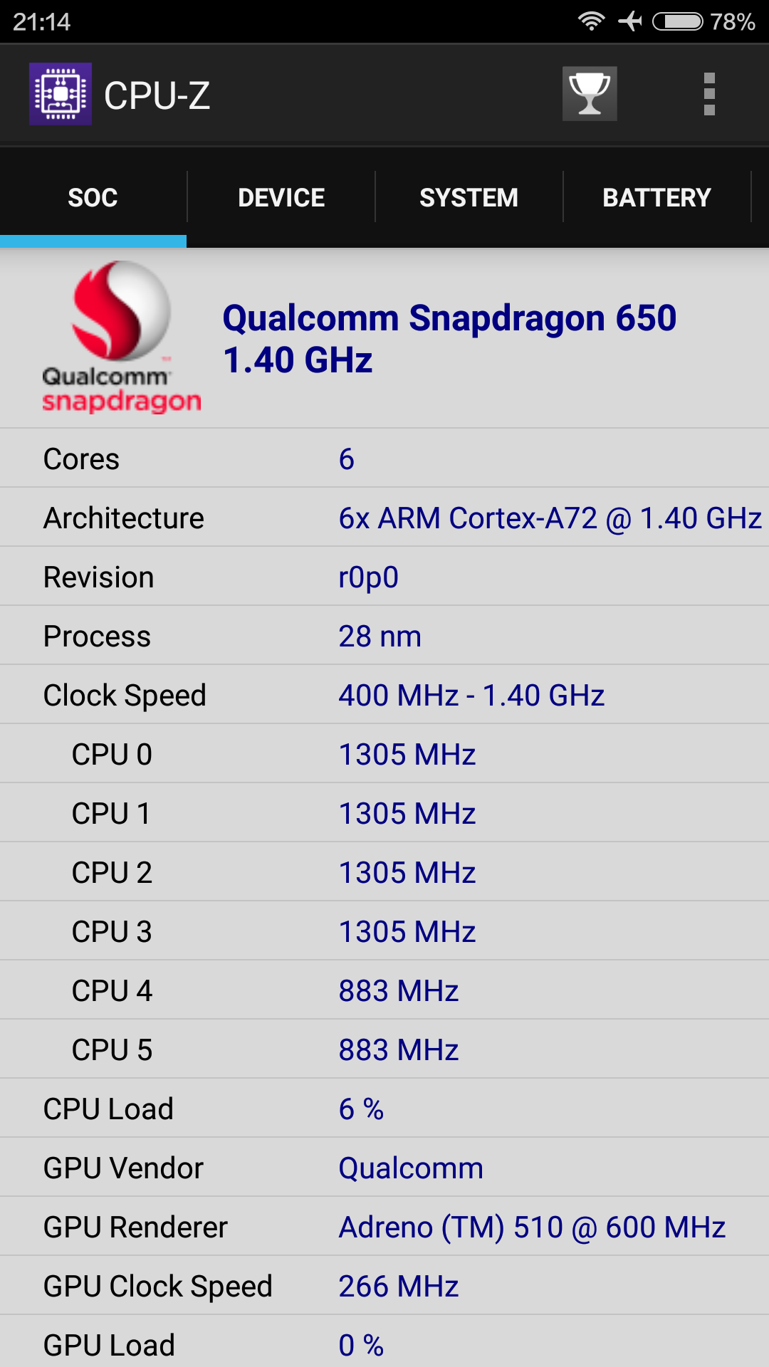 το cpuz γράφει Qualcomm Snapdragon 650 1.40GHz και 6χ ARM Cortex A72 με Adreno 510@600 MHz αλλά board= msm8952.
