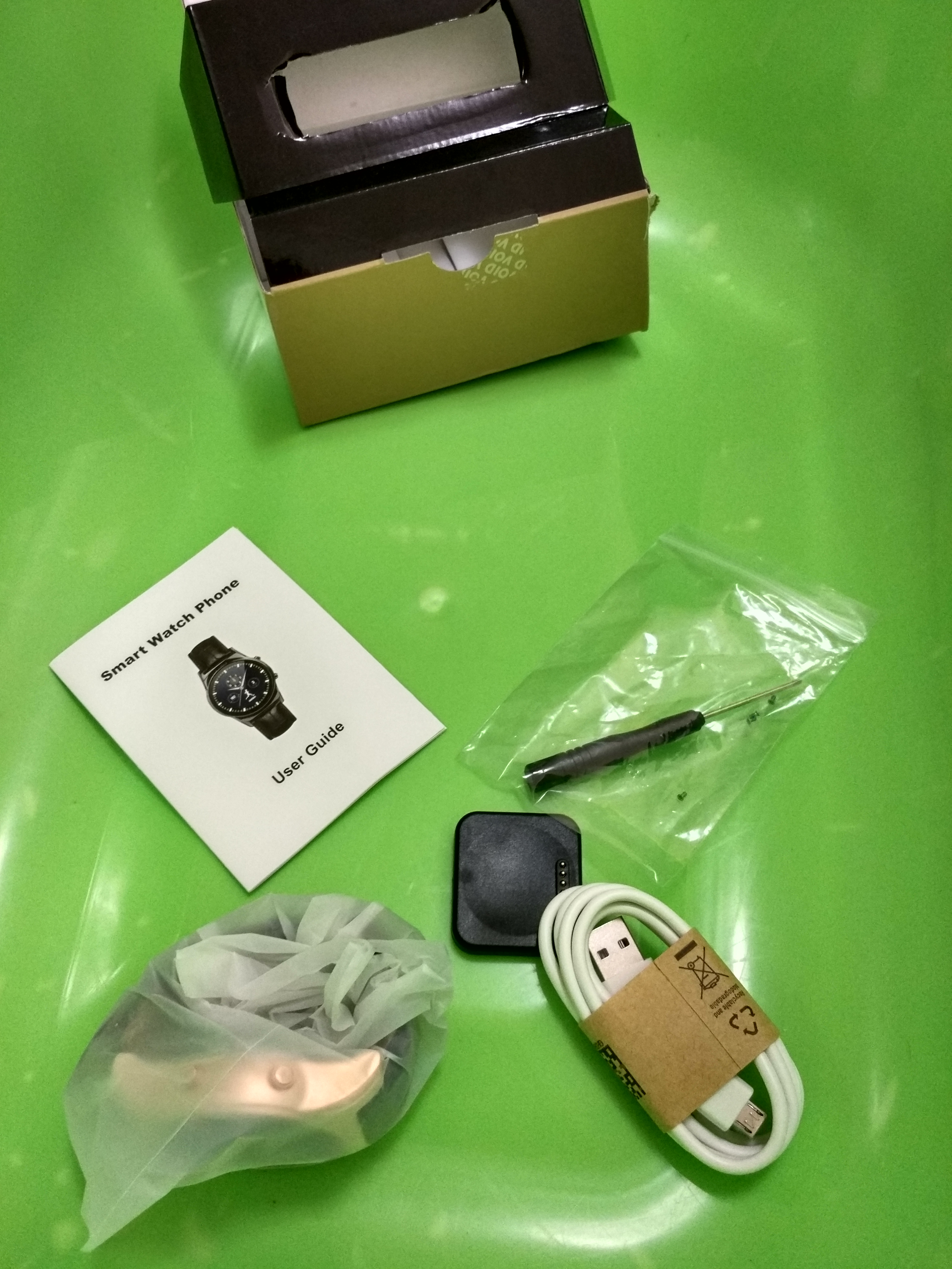 Ανοίγοντας το κουτί μέσα υπάρχει το ρολόι, ο φορτιστής του, ένα Αγγλικό manual και ένα κατσαβιδάκι με 4 βίδες μικρές σαν ανταλλακτικά.