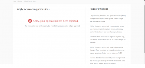 Θα πρέπει να στείλεις ένα μήνυμα στο forum Complaints/Advice - Xiaomi MIUI Official Forum (ή/και να προσπαθήσεις να ξαναδοκιμάσεις miui.com/unlock/apply.php?retry=1 - Συνήθως όμως θα έπρεπε να βλέπεις ένα reapply στο screenshot που στέλνεις κάτω απο το reject οπότε δεν νομίζω οτι θα μπορέσεις) .