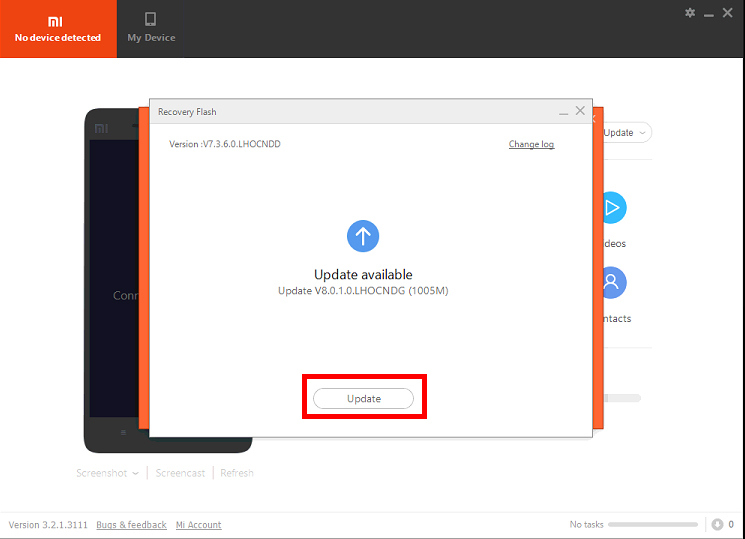 Στην πρώτη λοιπόν περίπτωση το Mi PC Suite θα αναγνωρίσει μόνο του το κινητό και στην οθόνη του υπολογιστή μας θα εμφανιστεί μήνυμα για Update όπως φαίνεται στην παρακάτω φωτογραφία.