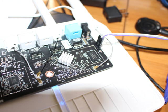 Εκτός από τις 3 GLGNET GSD16002LF 100Mbit θύρες, περιέχει ακόμα ένα Mediatek MT7612EN 802.11a/b/g/n/ac Wi-Fi 2T2R chip, ένα άλλο chip κάτω από μία ψύκτρα, που πρέπει να είναι το MT7620A και ένα NANYA NT5TU64M16HG-AC DDR2 chip (64 MB). Επίσης δεξιά βλέπετε μία βάση για σειριακή σύνδεση, που θα σας πω πιο κάτω τι βγάζει... Οι 2 5GHz κεραίες στα αριστερά και οι 2 2.4GHz κεραίες στα δεξιά, είναι στο πάνω μέρος.