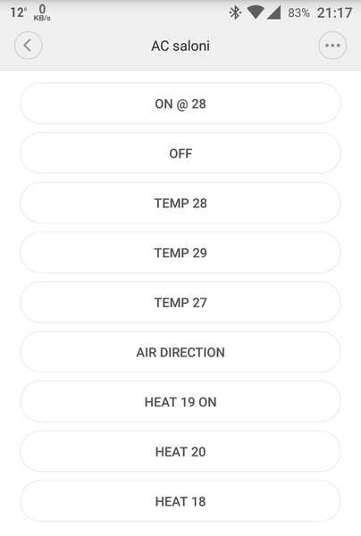 τα +/- θερμοκρασίας δεν θα σου δουλέψουν, λογικό: γιατί το κάθε +/- στα κλιματιστικά, είναι συνάρτηση του τι είχε σεταρισμένο πριν. Αλλά τα καρφωτά δεν μπορούν να ξέρουν τι είχες πριν... αν δεις το δικό μου παράδειγμα, έχω εντολή για κάθε θερμοκρασία που σετάρω, είτε στο ζεστό είτε κρύο. -