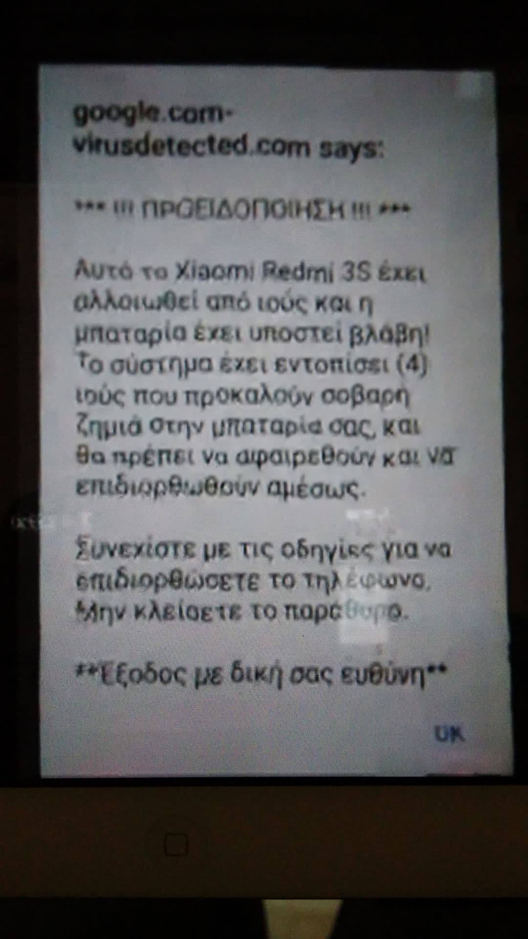 Καλησπέρα. Έχω ένα θέμα με το κινητό του πατέρα μου. Μπήκε σε κάποια σελίδα και πάτησε κάποιο link φαίνεται και από εκείνη τη στιγμή του βγάζει το μήνυμα που είναι στην εικόνα. Λογικά κάποιου είδους malware/virus.
