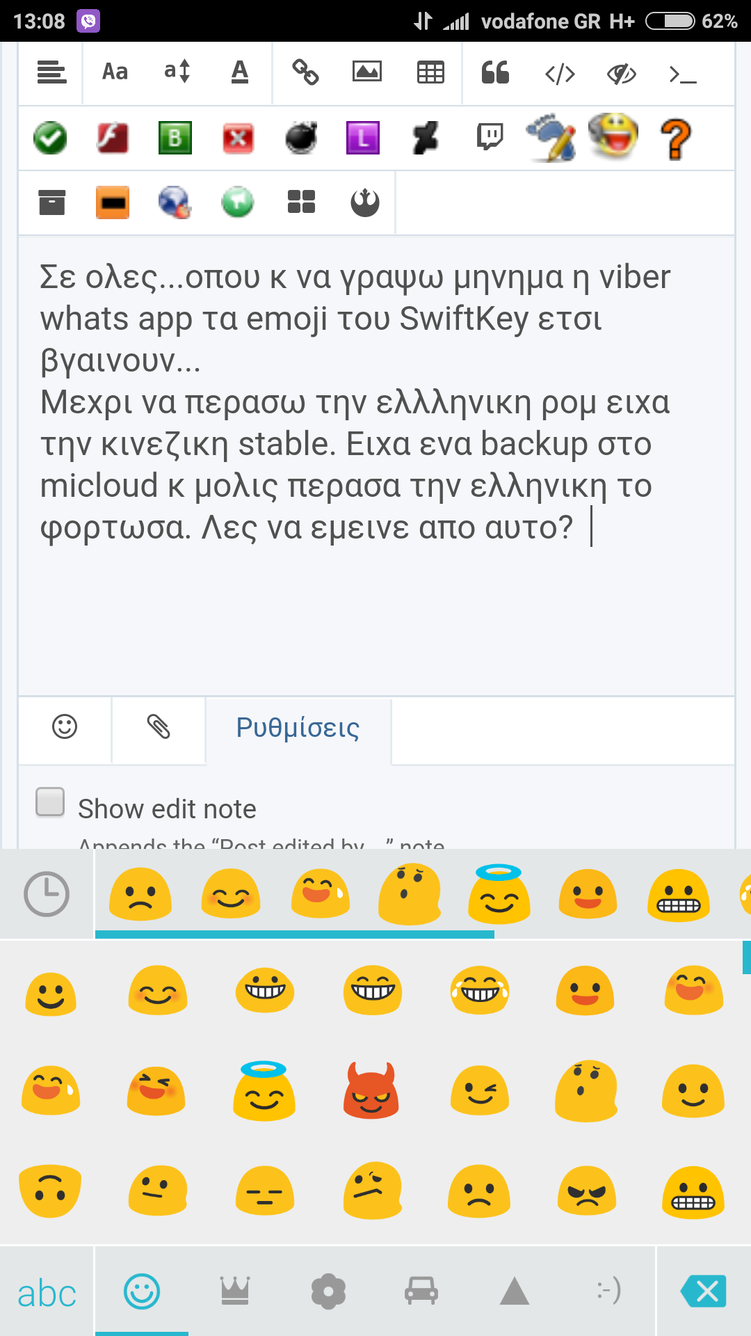 Απο την αρχη που εχω περασει τις ελληνικες ρομ αλλα κ πριν με την κινεζικη στο πληκτρολόγιο δεν μου εμφανιζονται κανονικα τα emoji οσα κ να εχω περασει... Δεν γνωριζω αν γινεται κ σε αλλους αλλα πως γινεται να διορθωθεί αυτο??? Ειναι θεμα ρομ ή καποιας επιλογης που δεν γνωριζω..???Ενημερωτικα φοραει την τελευταια ελληνικη ρομ dev