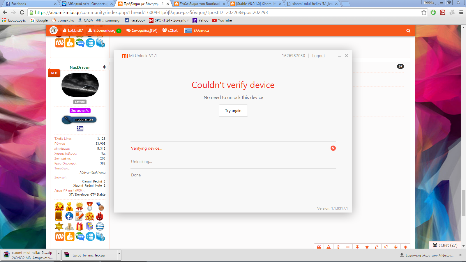 παιδια sos περασα την developer και πηγα να κανω unlock την συσκευη (γτ πηρα permission)απο την miui, αλλα στο 50% μου το πεταει εξω και δεν μου κανει verification την συσκευη!ξερετε τι μπορει να φταιει?