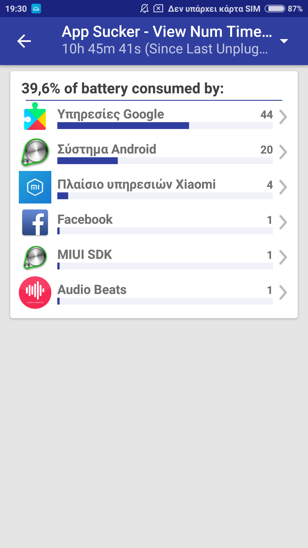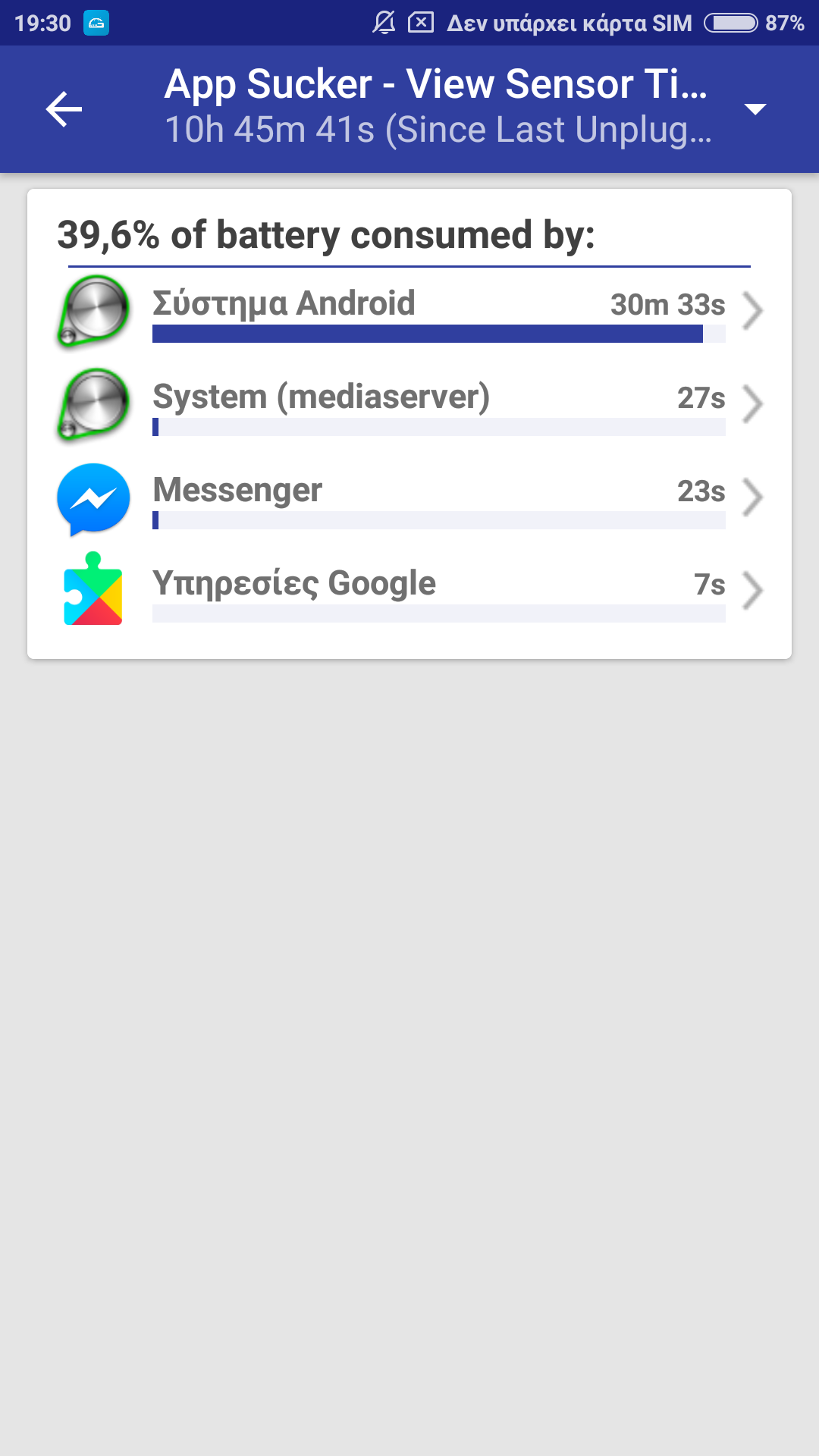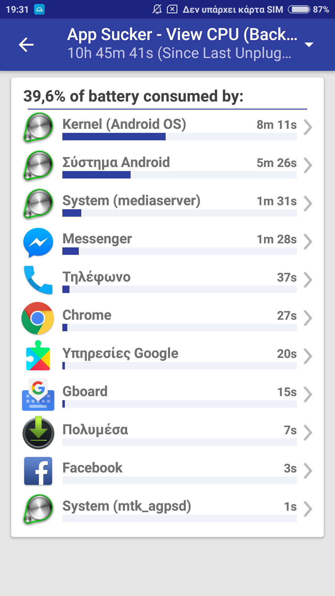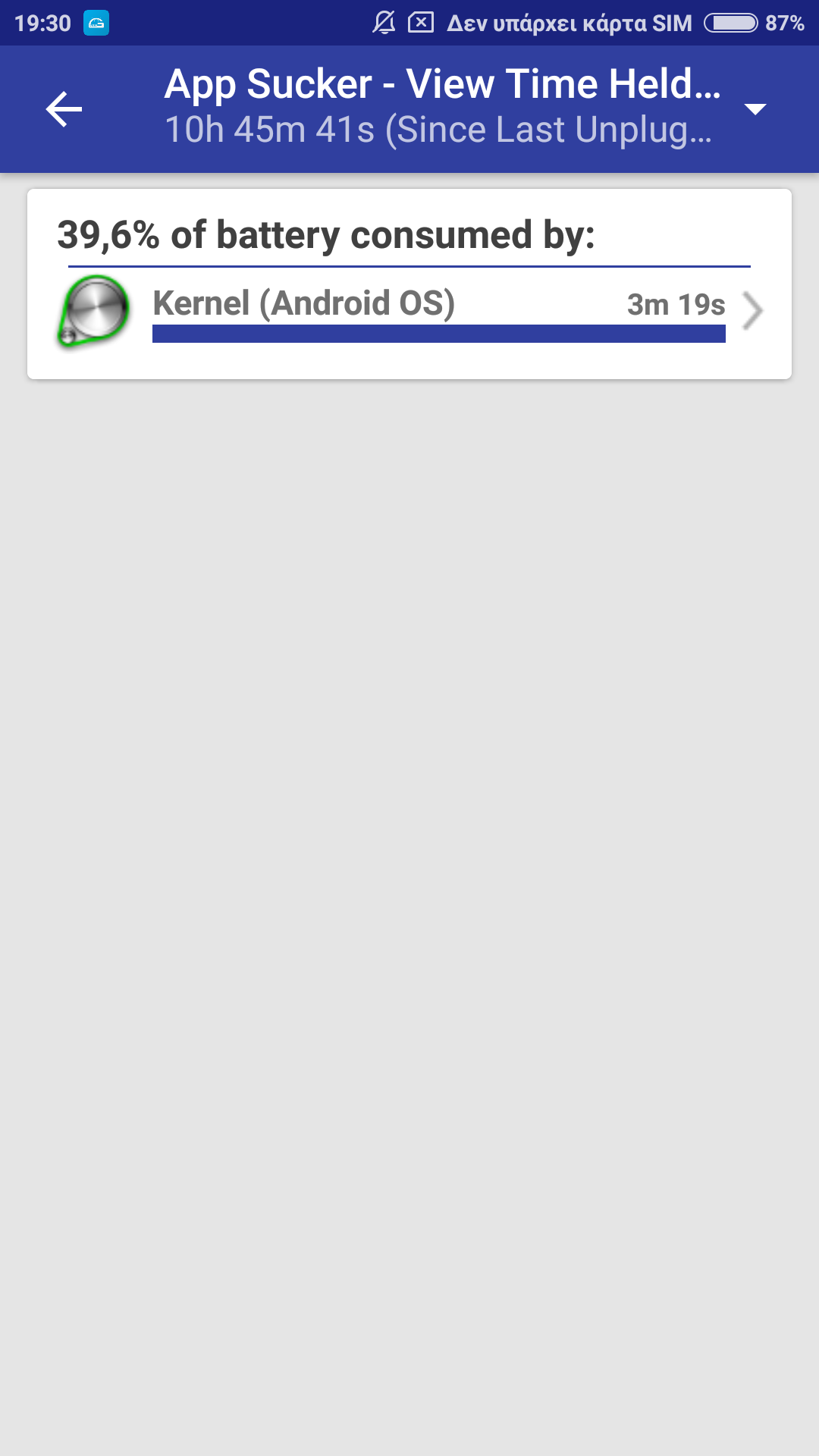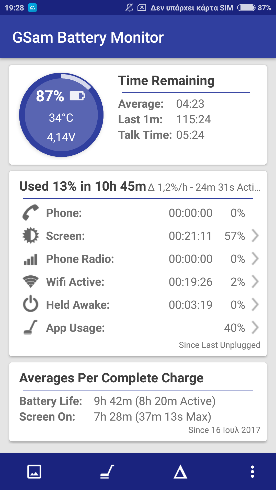 Και πάλι δεν θα βγει άκρη...Γιατί τα αποτελέσματα είναι μπασταρδεμενα..Από το 100 έως το 95 είχα ανοίξει wifi και ήμουν στο chrome...Και το άφησα από το 94 έως το 87 για 10 ώρες...Πρέπει να είναι το γεγονός ότι έχω εφαρμογες που ξεκινούν αυτόματα...Επίσης στην χρήση μπαταρίας μου δείχνει ότι η οθόνη ανοίγει για πολύ λίγο ανά διαστήματα