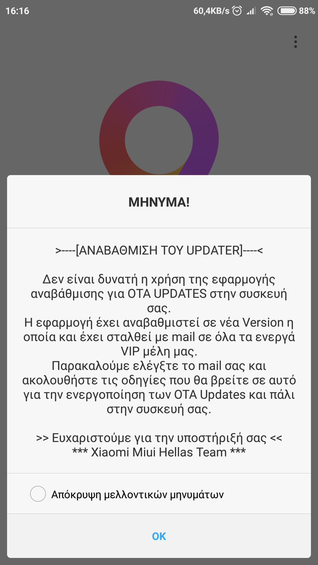 2) Θα γίνει κάποια ενημέρωση του OTA Updater? Την πρώτη φορά που μπήκα να δω για αναβάθμιση μου έβγαλε το γνωστό μήνυμα ότι δεν είμαι vip ή ότι δεν έχω ενημερώσει τον updater. Φλασαρα το ota_aroma.zip για developer rom και τώρα μου βγάζει ένα διαφορετικό μήνυμα (το έχω επισυνάψει)