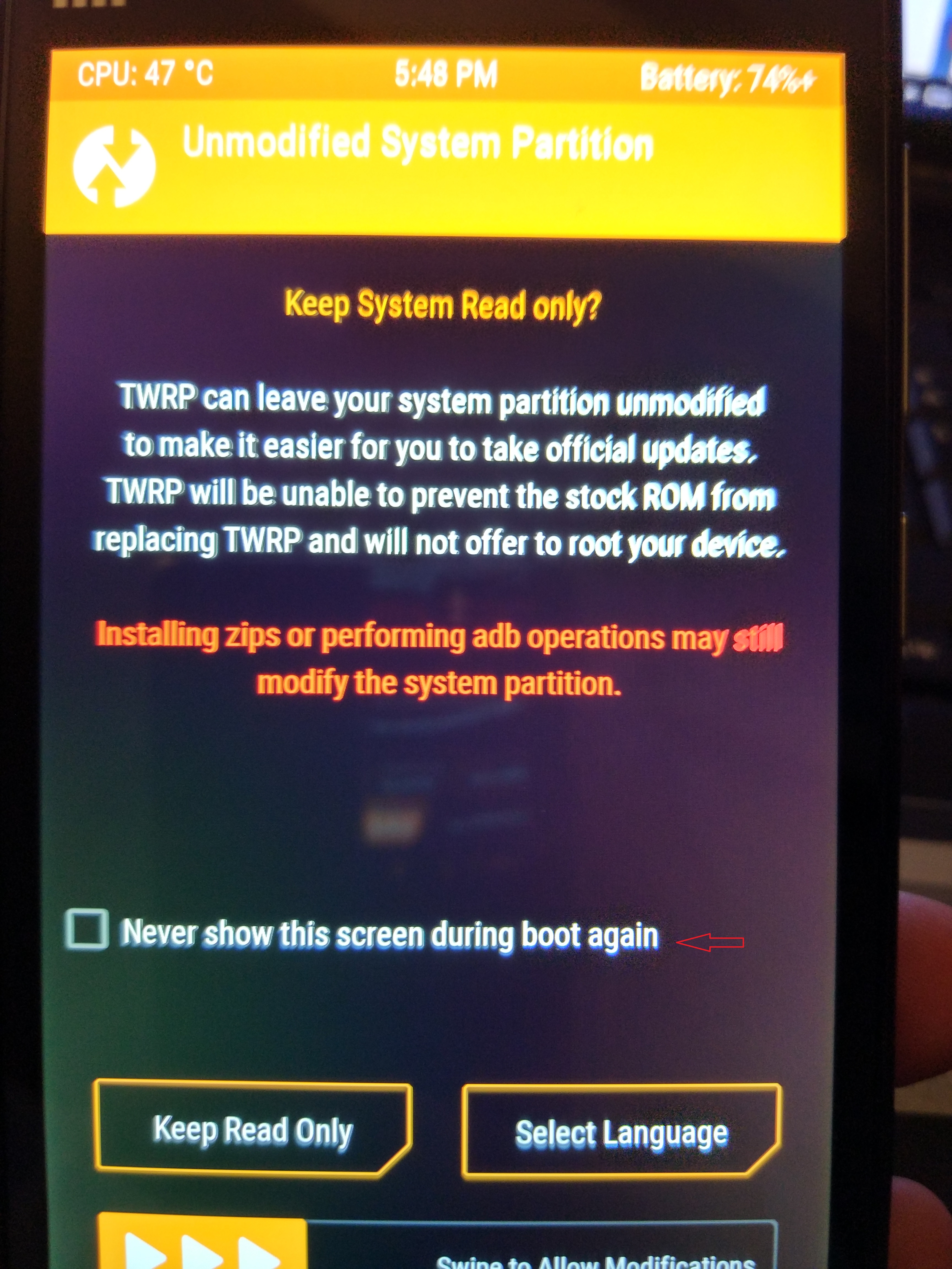 • @spideman3 Φίλε δεν δουλεύει.. Εκτός του ότι μου βγάζει πάντα προεπιλογή την κινεζική γλώσσα, κάθε φορά που επιλέγω never show this again Και κάνω επανεκκίνηση σε recovery πάλι μου εμφανίζει κινέζικα και επιλογή για allow modifications.. Και φυσικά δεν υπάρχει internal storage... Δε βρίσκω κανένα αρχείο.. Και δεν μπορώ εννοείται να φλασάρω τίποτα πάρα μόνο αν ξανά περάσω recovery πάλι.. Μπορείς να μου πεις που βρίσκεται η άλλη λύση που έδωσαν;