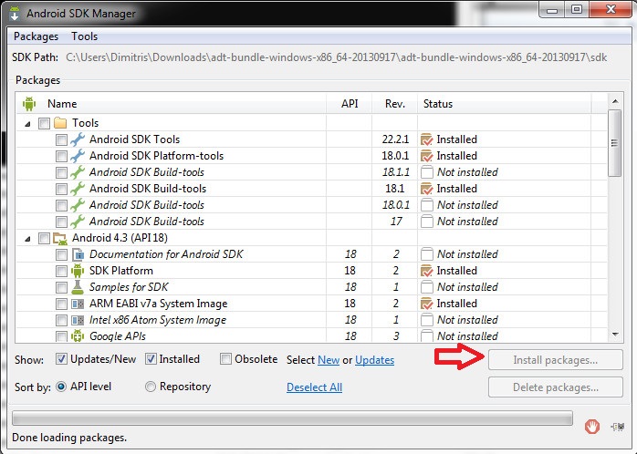 - Βρίσκουμε και τρέχουμε το αρχείο με το όνομα android.bat κα αμμέσως ανοίγει η εφαρμογή Android SDK.