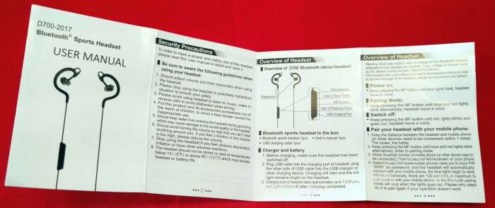 Αφού βγάλουμε την ζελατίνα και ανοίξουμε το κουτί, μέσα θα βρούμε τα D700-2017 BΤ ακουστικά, 2 σφουγγαράκια ανταλλακτικά των ακουστικών, ένα USB καλώδιο για να φορτίσουμε τα ακουστικά μας, ένα εγχειρίδιο στα αγγλικά και ένα QC Pass αυτοκόλλητο. Το εγχειρίδιο εξηγεί αναλυτικότατα τι είναι που και πως δουλεύει. Είναι γραμμένο σε απλά αγγλικά, οπότε δεν νομίζω θα δυσκολευτεί κάποιος.