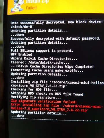 Μπες στο recovery μετά settings και δες επανω εάν είναι τικαρισμένο το zip signature