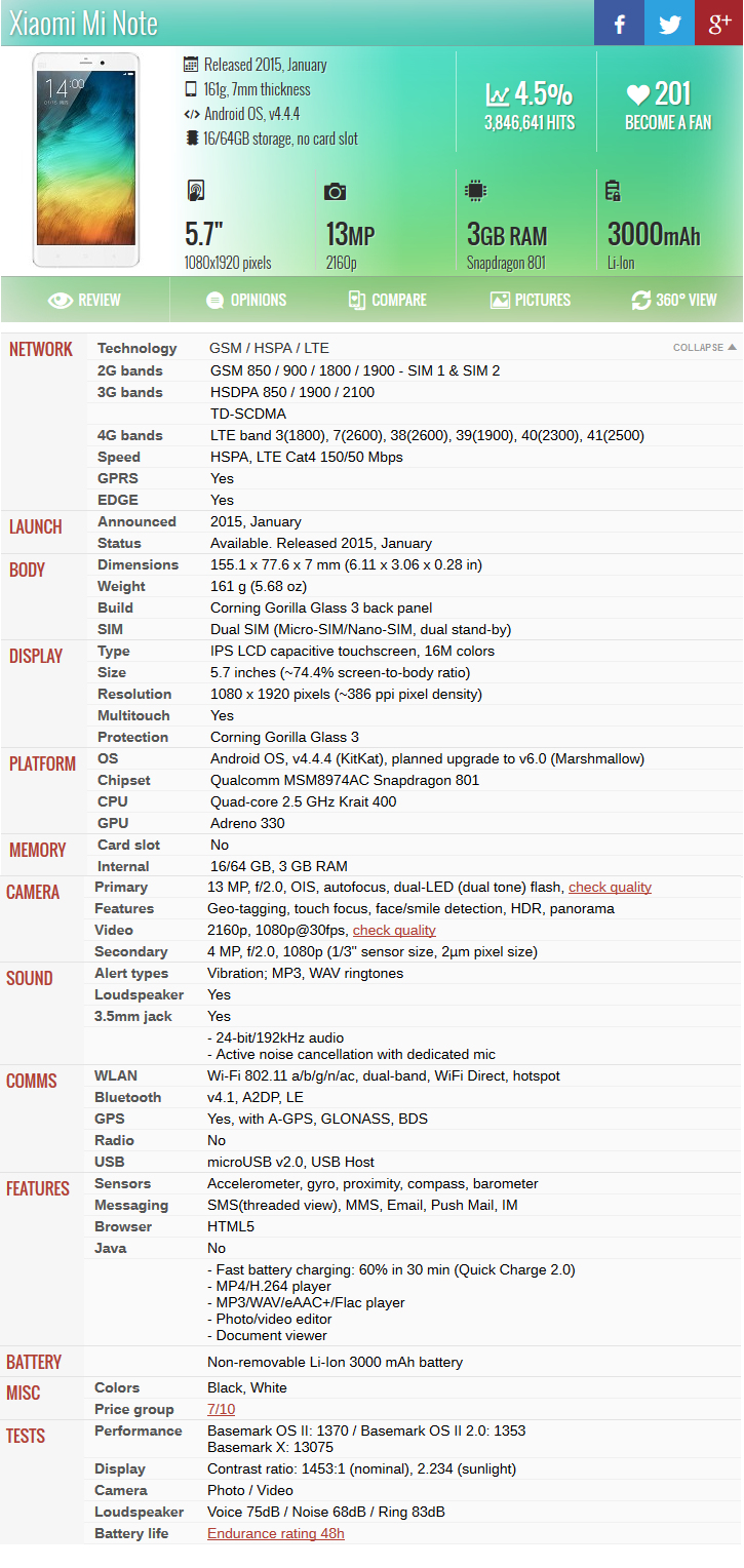 Καρφιτσωμένο Τεχνικά Χαρακτηριστικά Mi Note