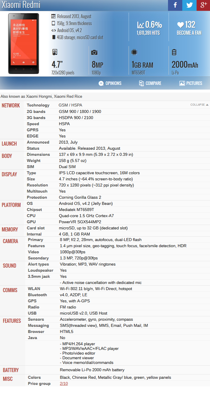 Καρφιτσωμένο Τεχνικά Χαρακτηριστικά Hongmi Redmi