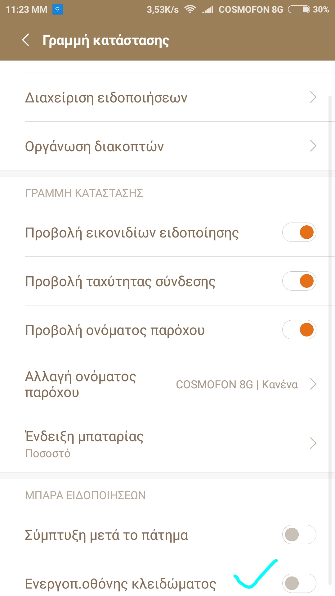 καλησπέρα, υπάρχει δυνατότητα σε οποιαδήποτε συσκευή xiaomi να κλειδώνει η μπάρα ειδοποιήσεων - γραμμή εργασιών και ενώ να ειδοποιεί τον είτε με LED η ήχο για εισερχόμενο, αν κάποιος τρίτος επιχειρεί να δει την μπάρα-γραμμή ειδοποιήσεων του επιτρέπει να δει οτι υπάρχει ενα μήνυμα κάποιας εφαρμογής με τον αποστολέα να φαίνεται. υπάρχει τρόπος δηλαδή να κλειδώνει η μπαρα και να μην κατεβαίνει για τριτους οπως πχ συμβαίνει σε άλλες συσκευές?