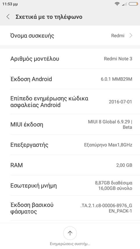 @Soulitas, η ερώτηση μεταφέρθηκε εδώ, ανέβασε μία φώτο αυτά που δείχνει στο about phoneSoulitas - 9 λεπτά νωρίτερακαλησπέρα. έχω το redmi note 3 pro και είμαι ολίγον ασχετος. το κινητο το πήρα πριν 2 βδομάδες με miui7. με διάφορους τρόπους κατάφερα και το αναβάθμισα σε miui8 αλλά το αποτελεσμα ήταν να χάσω τα ελληνικά και να έχω μόνο αγγλικά και κινέζικα. πως μπορώ να επιστρέψω στην αρχική κατάσταση?