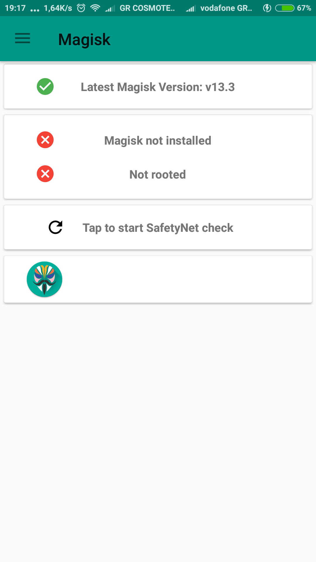 καλημέρα το magisk δεν υπάρχει πλεον στο play και δεν βρίσκει ο manager τον σύνδεσμο να το εγκαταστήσει.εγώ το έβαλα απο το XDA και το κατέβασε κανονικά για οποίον ενδιαφέρεται.Ο/H mass22 έγραψε:
