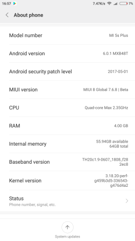 • Καλησπερα στην ομαδα, μολις αγορασα ενα μτχ 5s plus και φοραει την εξης. Με ενδιαφερει σε πρωτη φαση latest global stable (V8.5.3.0.MBGMIED (MIUI8) υποθετω). Θελει να προξεσω κατι σε bootloader αν ειναι locked/unlocked η απλα κατεβαζω και φλασαρω μεσα απο το κινητο?