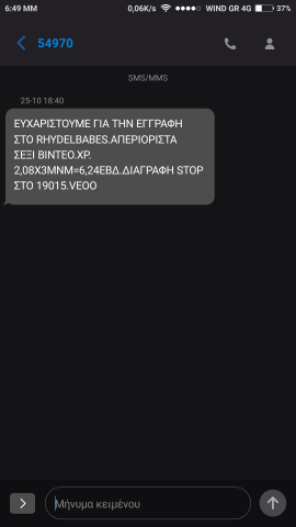 Λοιπον έχουμε και λεμε τον τηλεφωνικό μου αριθμο τον εχω σχεδόν 2 χρονια τωρα δεν τον εχω βάλει ποτε σε κανένα site για διαγωνισμούς για δώρα η για οτιδήποτε αλλο στα μονα που το εχω βαλει στο ίντερνετ ειναι στο email μου στο facebook και σε 2 site που παραγγέλνω στο εξωτερικό την gearbest και την fasttech, σήμερα λοιπόν μου ηρθαν 2 μηνύματα απο αριθμούς περίεργους θα τους δειτε ποιο κατω στης εικονες που εβαλα και γραφει κατι περιεργα οτι και καλα καπου εκανα εγραφη επιτυχως και θα αρχίσουν να με χρεώνουν καθε βδομαδα ενα ποσο, με τα πολλά κοίταξα και ειδα πως μου έφαγαν ολη την καρτα ευτυχώς εχω καρτοσυμβολαιο.