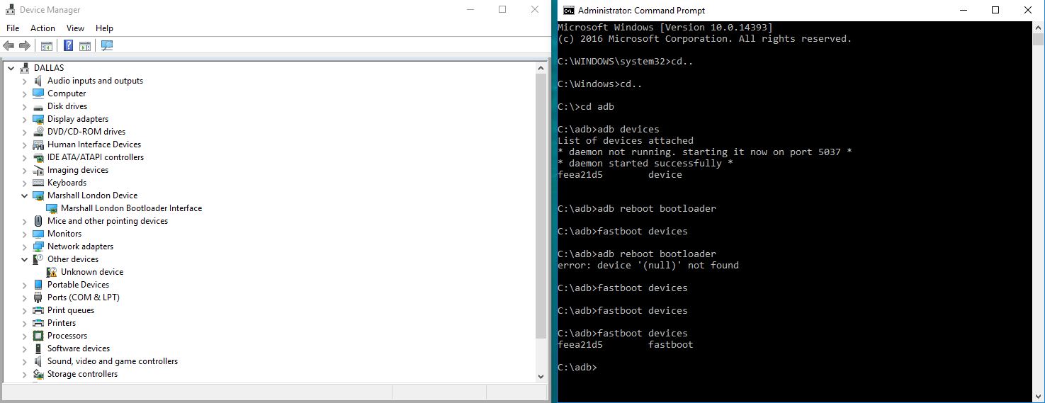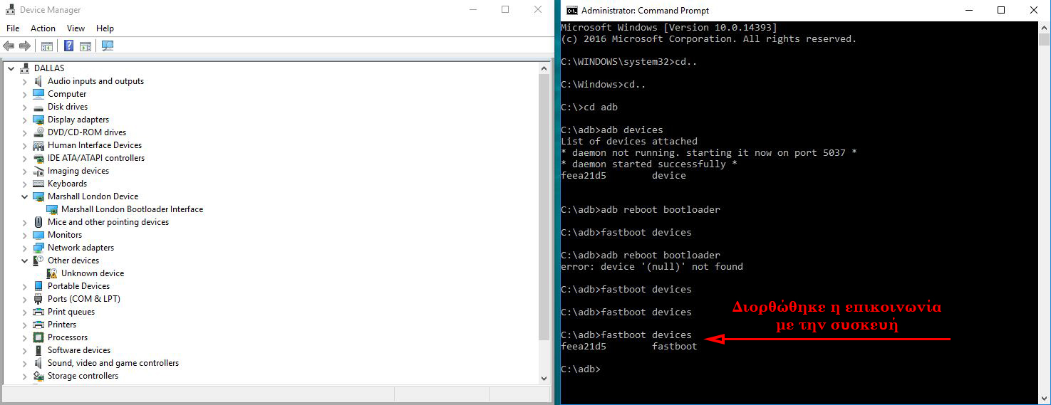 Τα κινητά όπως βλέπετε και στην παρακάτω εικόνα όταν τα γυρνάμε σε fastboot mode κανονικά πρέπει να αναγνωρίζονται ως "Marshall London Bootloader Interface" ή ως "Android Bootloader Interface"