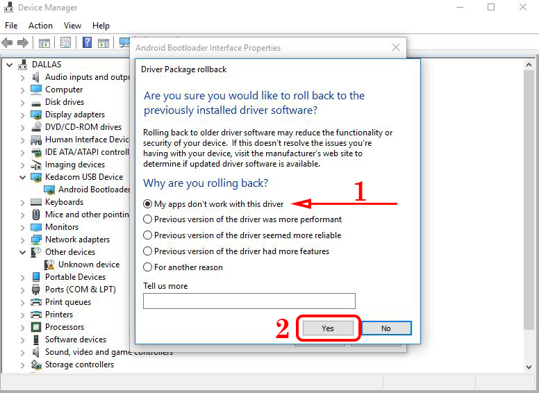 8 ) Πατάμε τώρα Close για να κλείσει αυτό το παράθυρο και μπορούμε να συνεχίσουμε κανονικά τις εργασίες μας στο CMD και να κάνουμε και flash και να περάσουμε TWRP χωρίς άγχος ότι θα γυρίσει στον λάθος Driver και θα χάσει την επικοινωνία. Στη παρακάτω εικόνα βλέπετε ότι επικοινωνεί μια χαρά το κινητό με τον υπολογιστή μετά την εφαρμογή του Roll Back Driver: