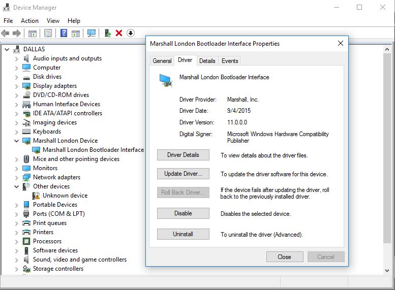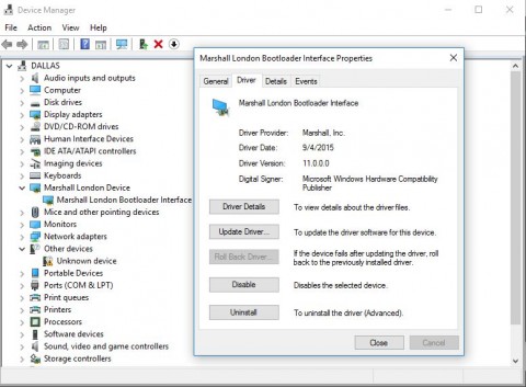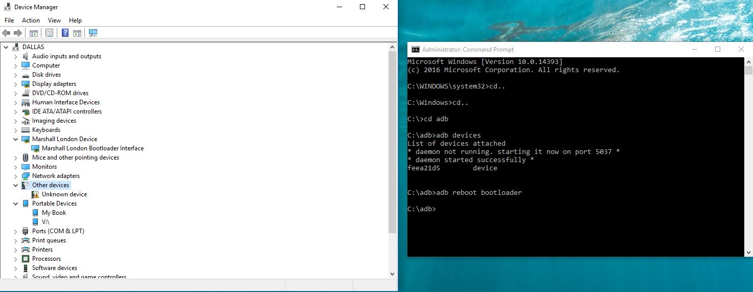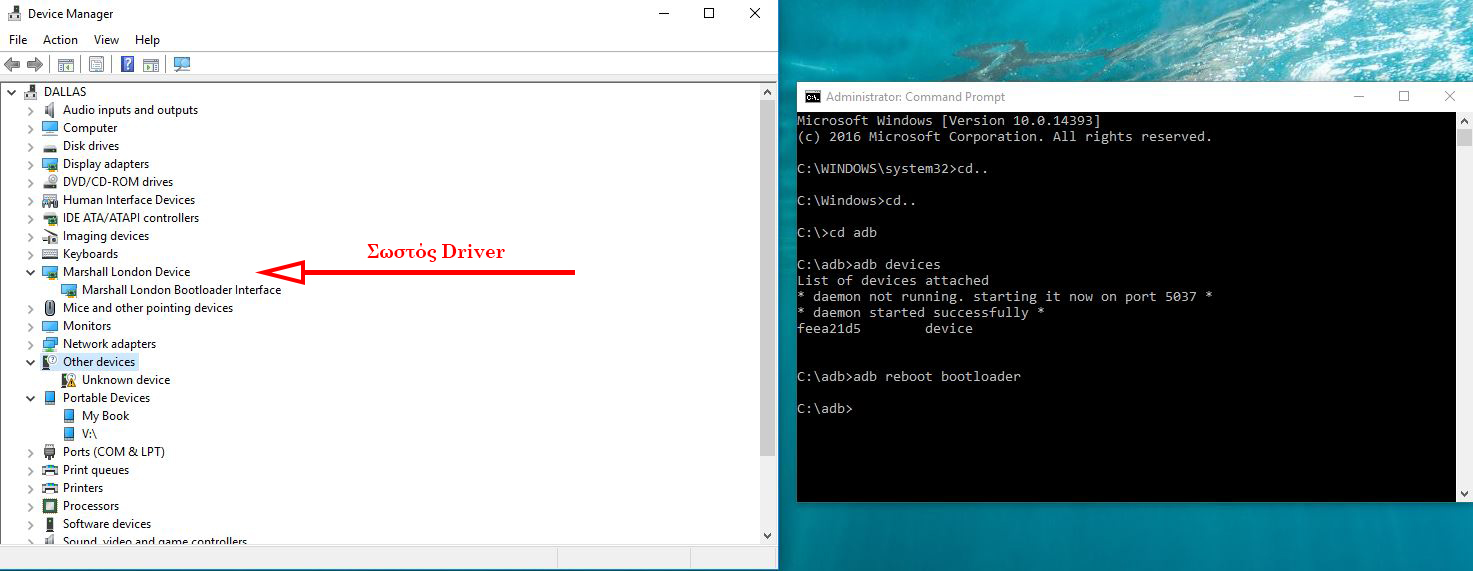 Τα κινητά όπως βλέπετε και στην παρακάτω εικόνα όταν τα γυρνάμε σε fastboot mode κανονικά πρέπει να αναγνωρίζονται ως "Marshall London Bootloader Interface" ή ως "Android Bootloader Interface"