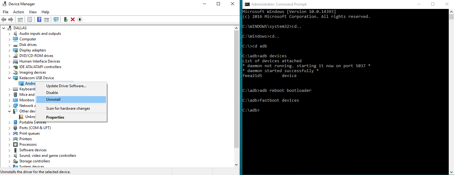 Δηλαδή ως "Kedacom USB Device". Με το που γίνεται αυτό χάνεται και η επικοινωνία του κινητού με τις εντολές fastboot και γενικότερα για να μπορέσει κάποιος να φλασάρει όπως μπορείτε να δείτε στην δεύτερη φωτογραφία. Έδινα την εντολή fastboot devices και δεν έστελνε τίποτα πίσω.