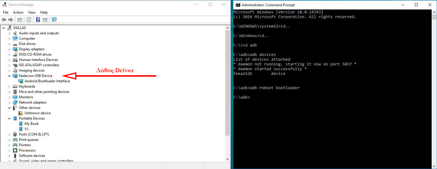 Με δοκιμές που έκανα είδα ότι με το που έκανα Unistall και κατάργηση του Driver επανερχόταν ο κανονικός και στο CMD την έβλεπα σωστά την συσκευή όπως μπορείτε να δείτε στην παρακάτω εικόνα: